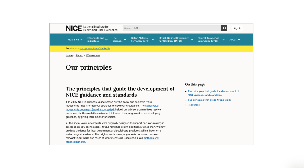 NICE makes very clear the social context in which it makes its recommendations. It takes a society-wide perspective, and its social values and principles are explicit. You can find them on the NICE website. Even if you don’t agree with its philosophical approach, you know what it is.